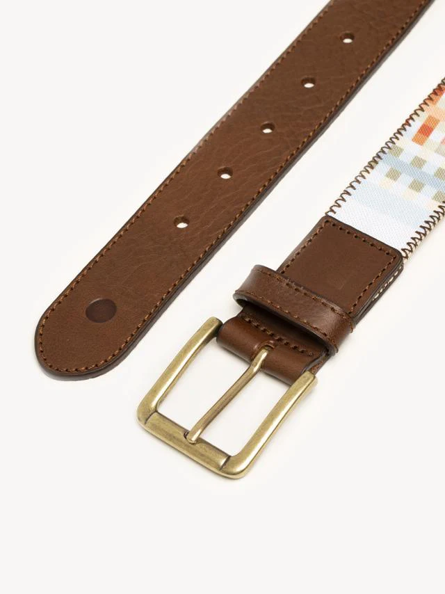 Jarugo es un cinturón para hombre hecho con una colorida tela y las terminaciones en cuero marrón de curtición vegetal que lo hacen perfecto para llevarlo con looks casual y smart-casual.